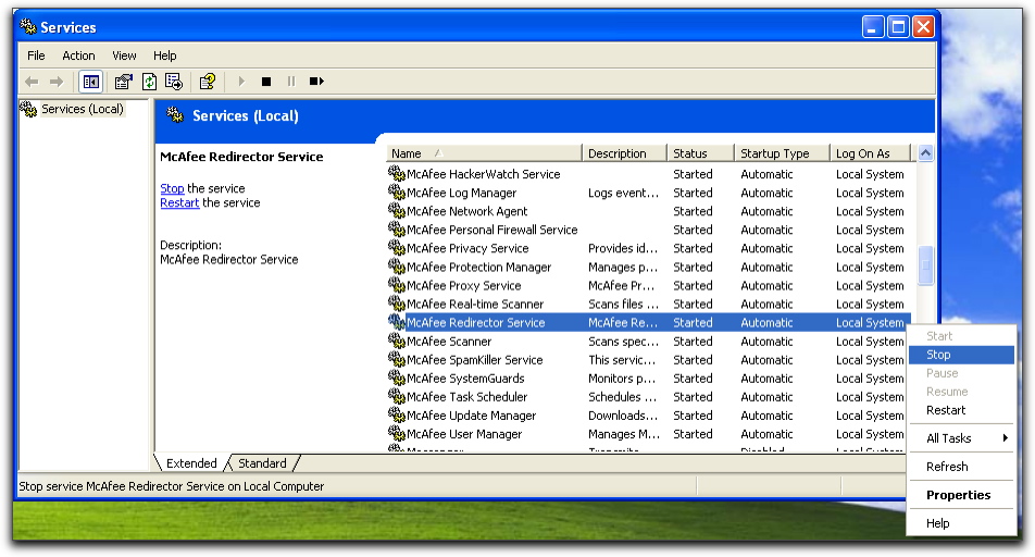 4. McAfee Redirector service¸ñ·ÏÀÇ ¿À¸¥ÂÊ Å¬¸®À» Çϰí, contectualÀÌ ¸Þ´º¿¡¼ ³ªÅ¸³ª¸é ¸ØÃß¼¼¿ä.